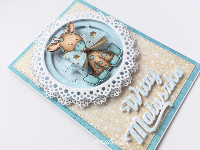 Kartka z pudełkiem ozdobiona słodką żyrafką i muszką
